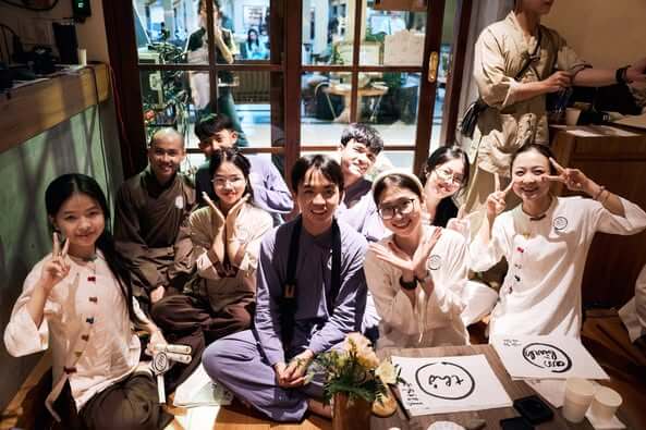 Thế rồi, những vị khách đầu tiên đã tới, trong con vui lắm, vì từ trước đến nay, con tham gia workshop với tư cách là người tham dự, còn hôm nay con – là ban tổ chức, là người đón tiếp những người khách thân thương. Cả 3 khung giờ trong ngày, đội châm trà chúng con đều thực hiện thật tốt nhiệm vụ và luôn giữ được những bước chân an lạc, chánh niệm cho mình. Mùi vị trà thơm nóng, ngọt dịu tạo cho con cảm giác an lành, con như được trở về nương tựa thân và tâm của mình. Ngồi xuống, cầm ly trà nóng ấm trên tay, con không còn suy nghĩ xa vời mà chỉ quan tâm, để ý tới khói trà hòa cùng tiếng ca ngọt ngào của các nghệ sĩ hiến tặng nghệ thuật cho buổi workshop. Con cũng cảm nhận được rằng, không chỉ có con mà tất cả các vị khách tham gia Workshop đều thoải mái, thư giãn và an lạc trong suốt hơn 2 tiếng đồng hồ diễn ra hoạt động. Suốt một ngày Thầy của chúng con chắc hẳn đã thấm mệt – nhưng trên môi thầy luôn nở nụ cười, khuôn mặt Thầy luôn tươi mát và Thầy luôn động viên chúng con phải thật chánh niệm trong từng bước chân mình. Con cũng thật hạnh phúc khi được nhìn thấy Thầy Yên Tử hướng dẫn tất cả mọi người tập viết thư pháp. Con muốn xin Thầy Yên tử một chữ nhưng khách quá đông nên con sợ thầy mệt nên con đành để lần sau xin bù 10 chữ từ Thầy ạ. Thư pháp chánh niệm có lẽ là một khái niệm khá mới với con và mọi người, thế nhưng ai cũng thực tập cách viết – có cô chú viết thật đẹp, thật mềm mại; có anh chị còn khá lúng tung vì chưa quen tay; có em bé xin được cùng mẹ viết chữ. Chỉ vậy thôi nhưng trong mắt ai ai cũng ngập tràn niềm vui và hạnh phúc.