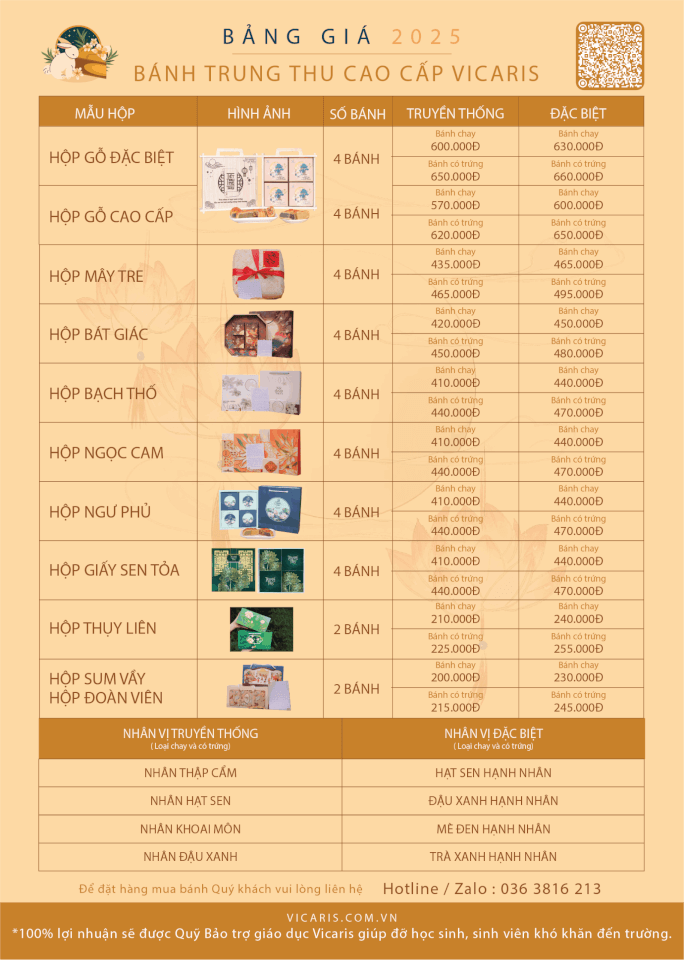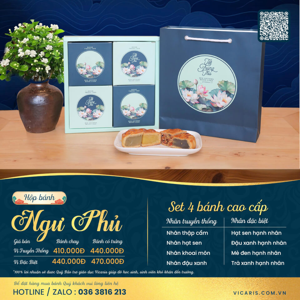 Quỹ Vicaris hân hạnh mang đến những chiếc bánh cao cấp thơm ngon, với 4 vị nhân truyền thống và 4 vị nhân đặc biệt.