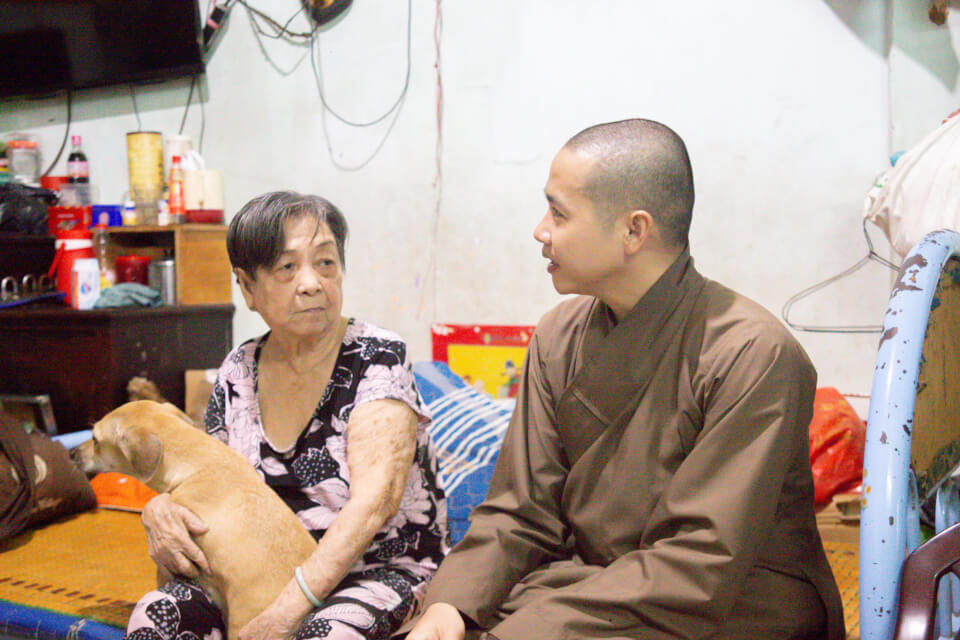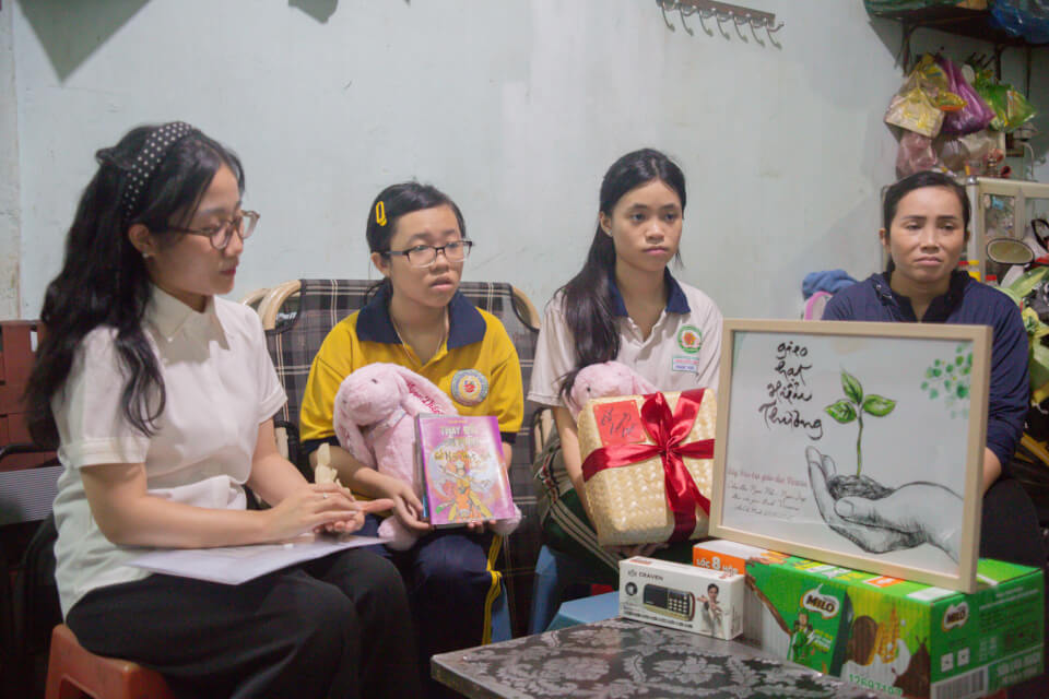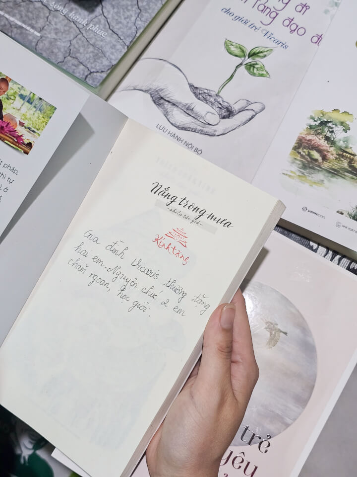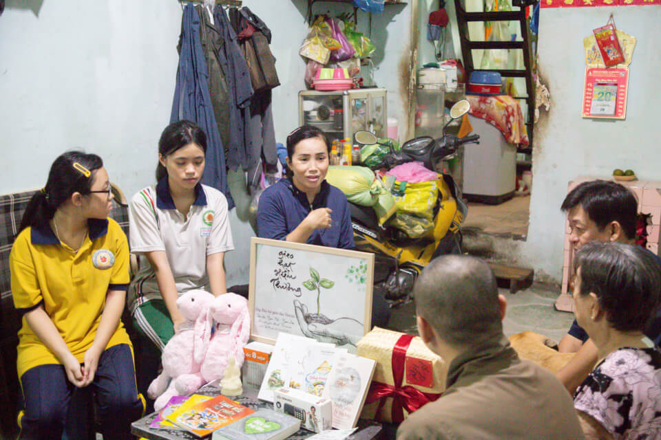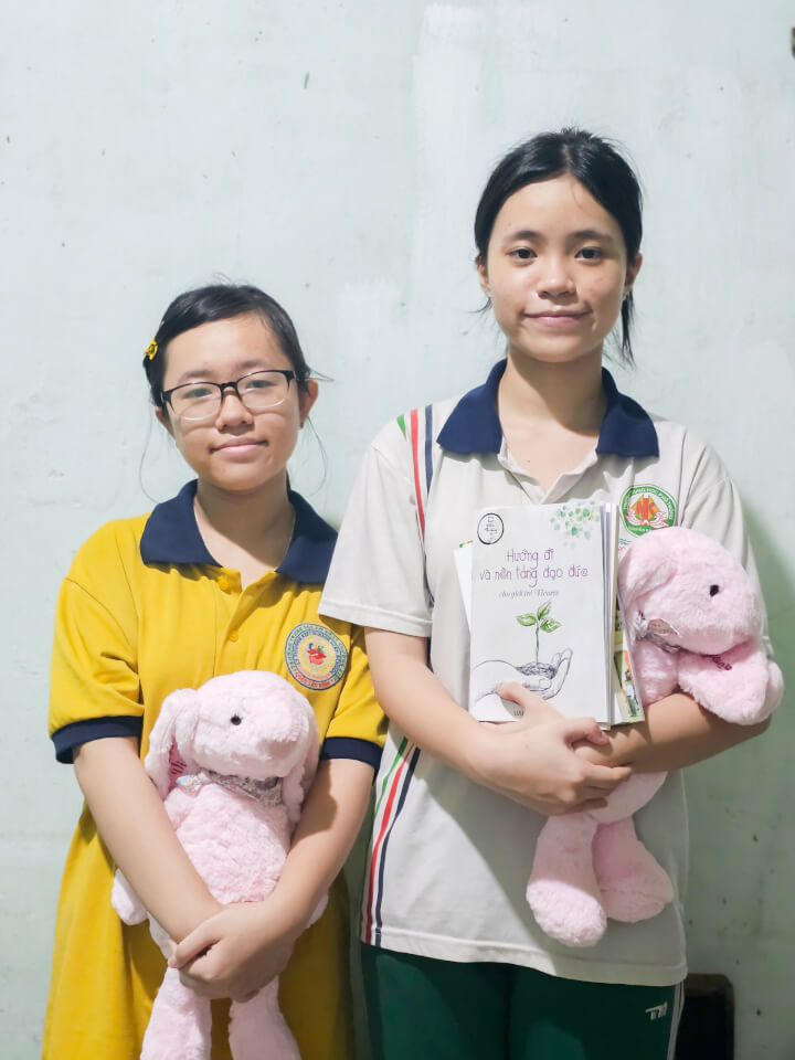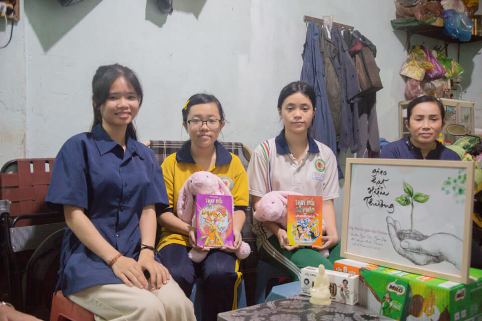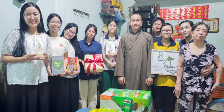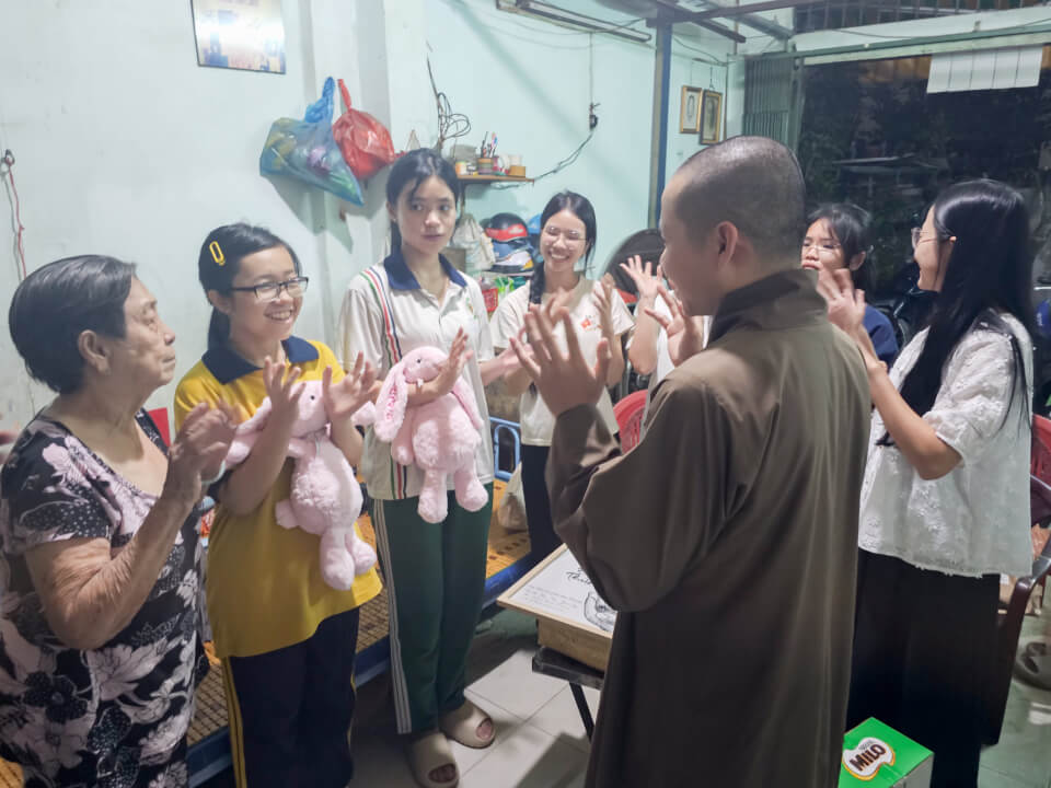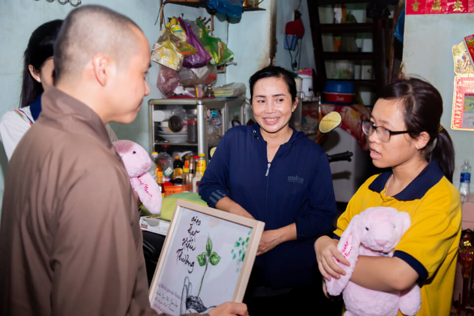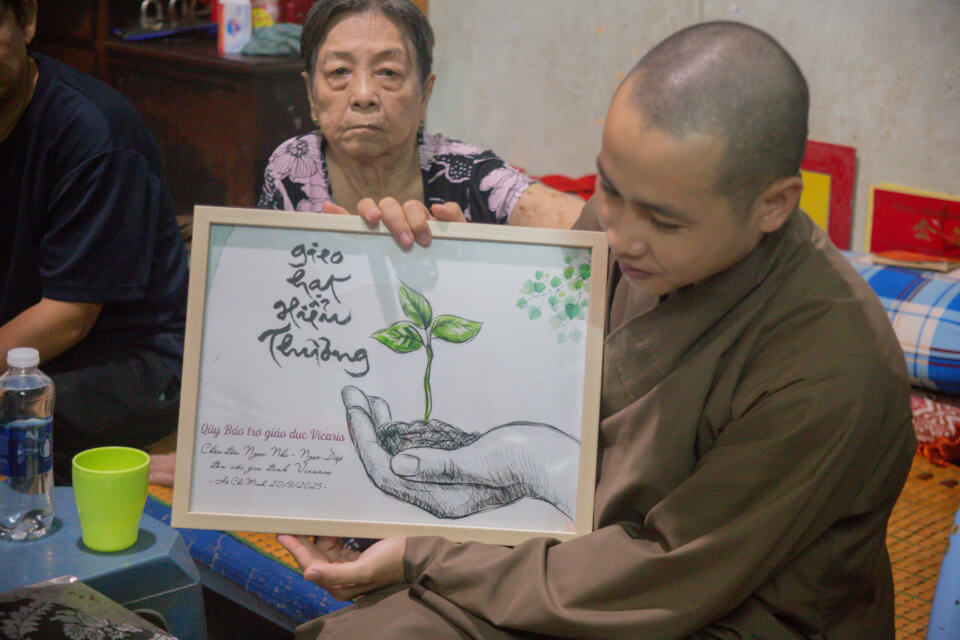 Trong chuyến thăm, Thầy Tuệ Đạt – Điều hành Quỹ Vicaris cùng các thành viên Ban chăm sóc đã mang đến cho hai em những phần quà giản dị: tịnh tài, sách, gấu bông, gạo, sữa… Căn nhà vốn chật hẹp hôm ấy bỗng sáng lên và rộn vang tiếng cười.