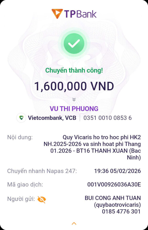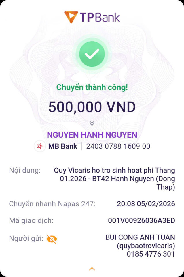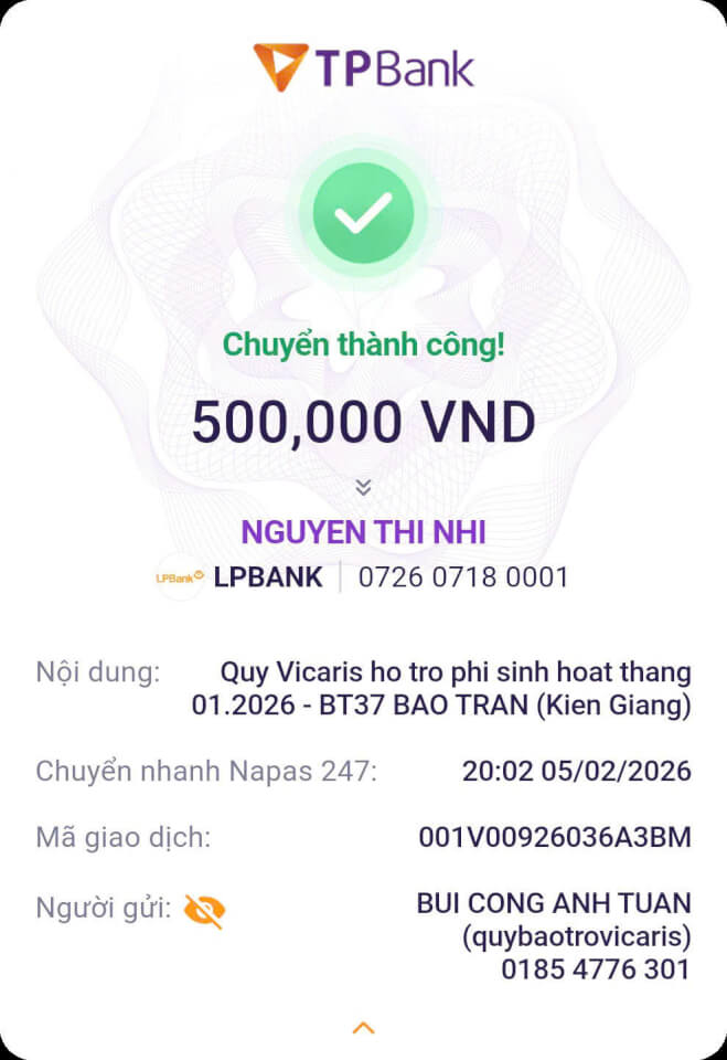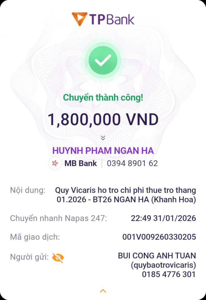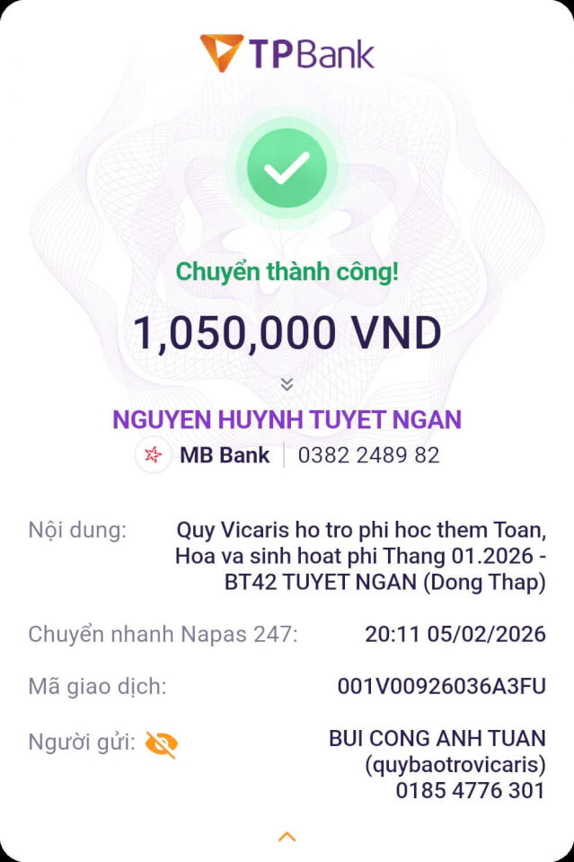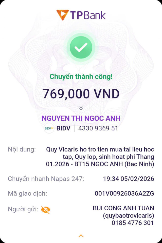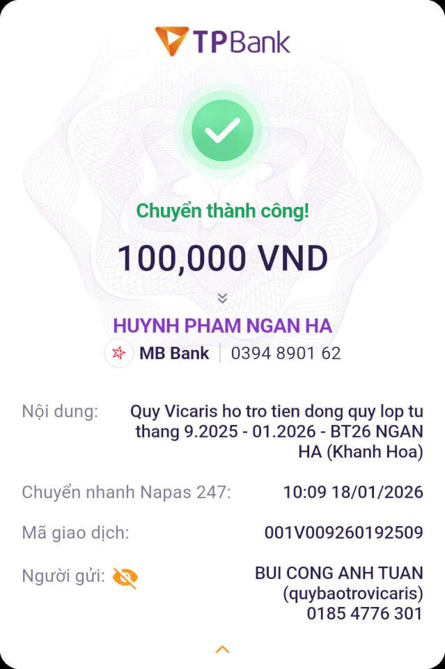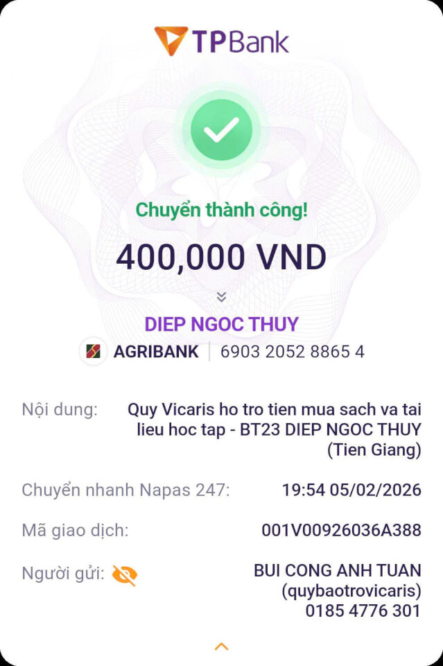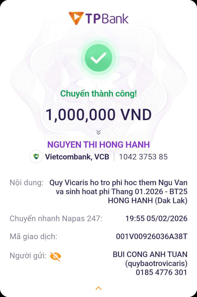 Trong tháng 01.2026, Quỹ Bảo trợ giáo dục Vicaris đã hỗ trợ 24/25 học sinh, sinh viên đang được tiếp nhận bảo trợ trong năm học 2025-2026, bao gồm học phí, sinh hoạt phí và các chi phí học tập khác. Trong đó, 04 anh em Thị Hà (Quảng Trị) tiếp tục nhận tiền bảo trợ được gửi trực tiếp từ quý mạnh thường quân.