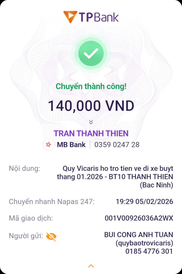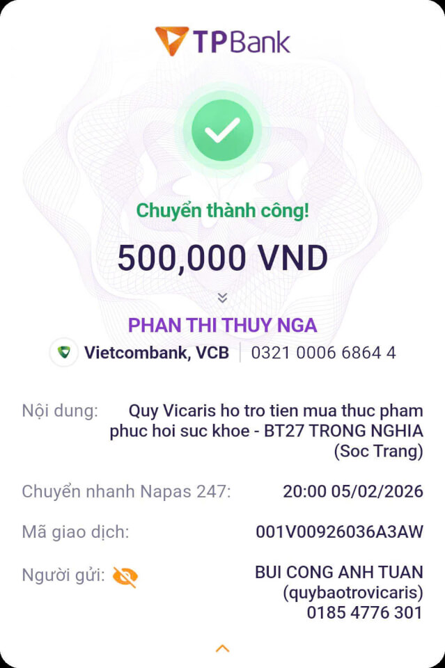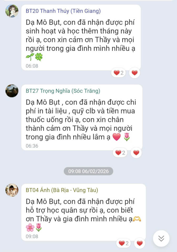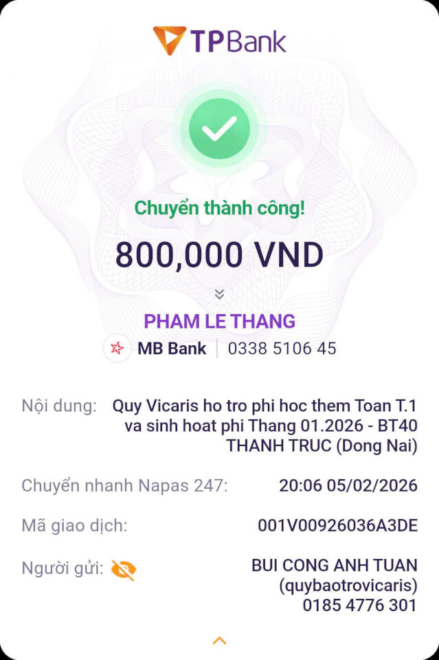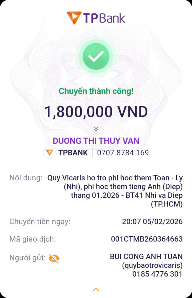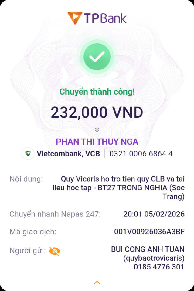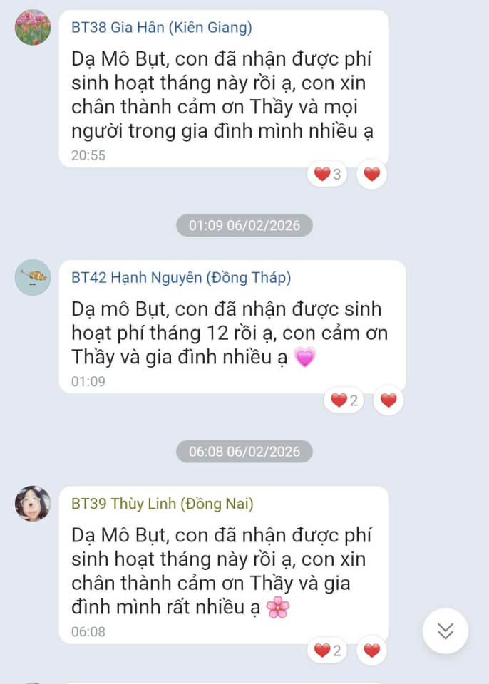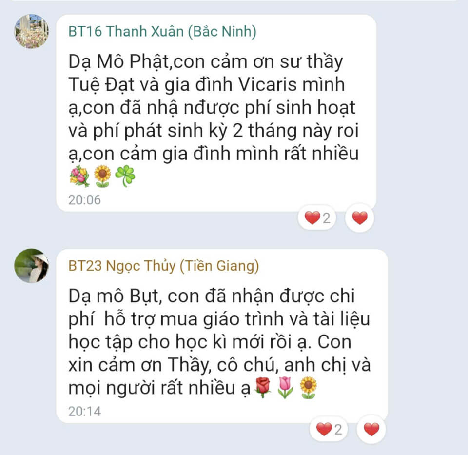 Trong tháng 01.2026, Quỹ Bảo trợ giáo dục Vicaris đã hỗ trợ 24/25 học sinh, sinh viên đang được tiếp nhận bảo trợ trong năm học 2025-2026, bao gồm học phí, sinh hoạt phí và các chi phí học tập khác. Trong đó, 04 anh em Thị Hà (Quảng Trị) tiếp tục nhận tiền bảo trợ được gửi trực tiếp từ quý mạnh thường quân.