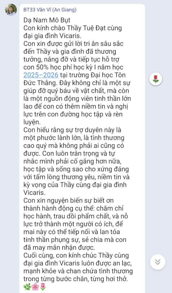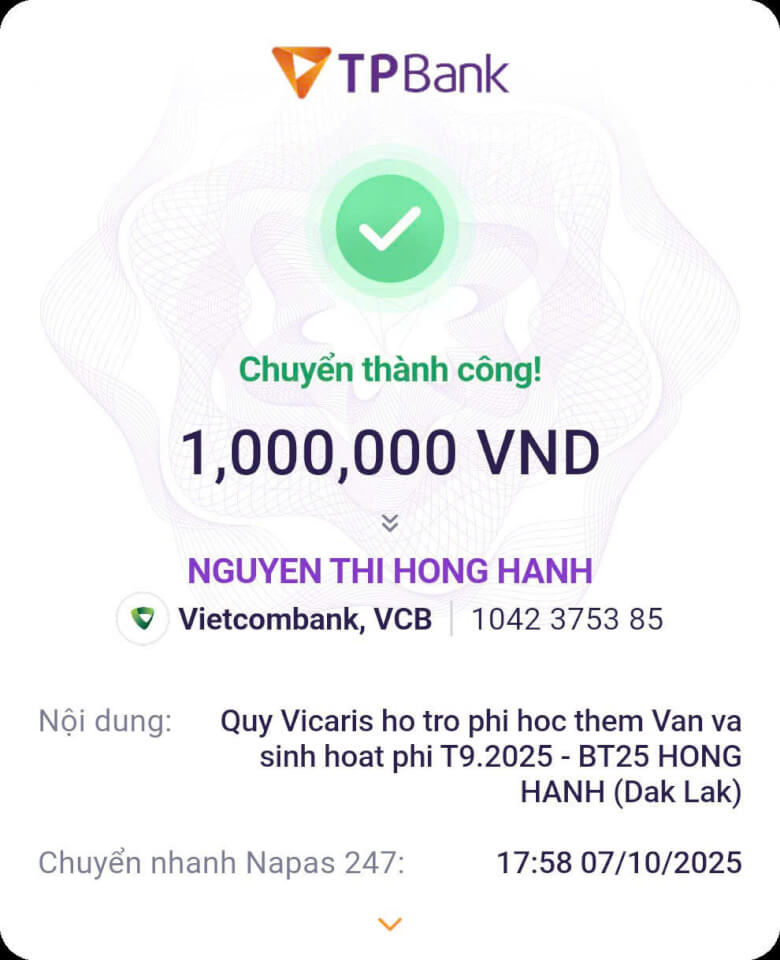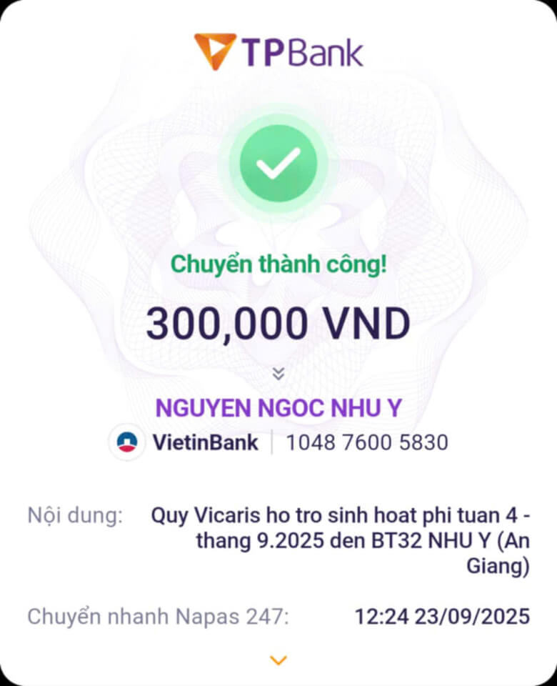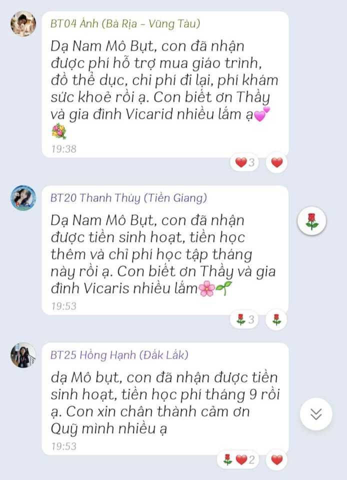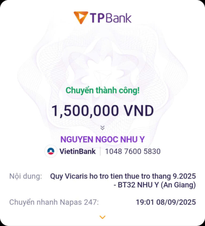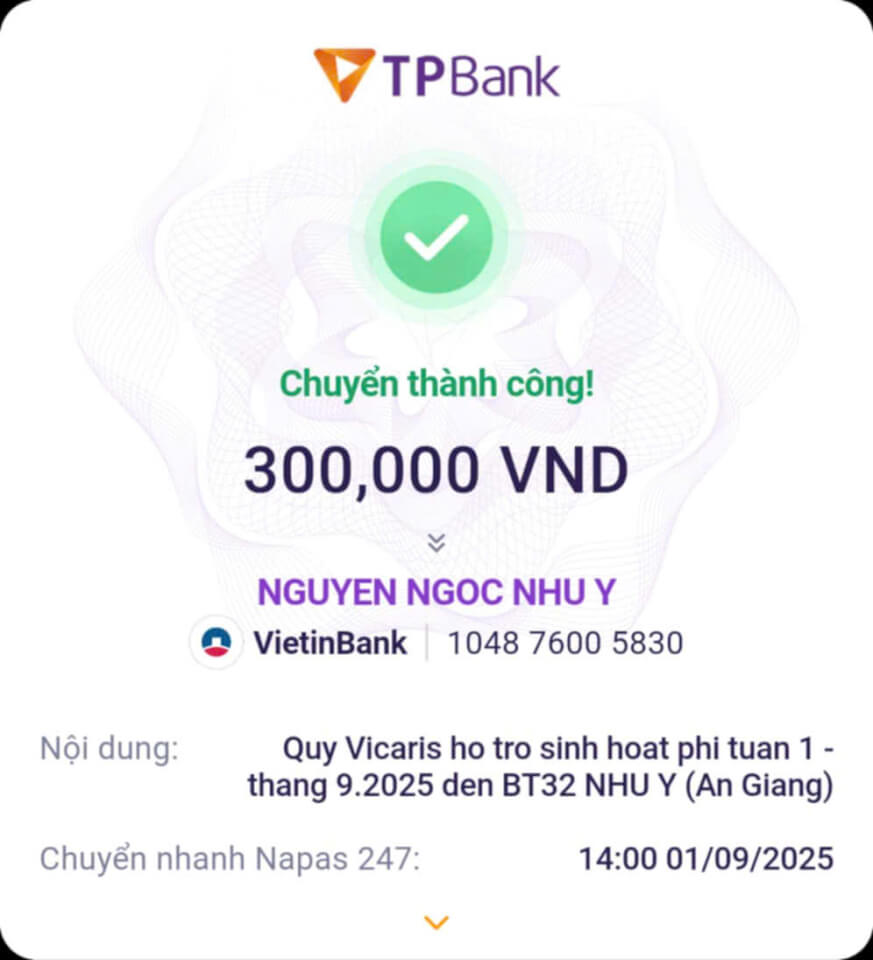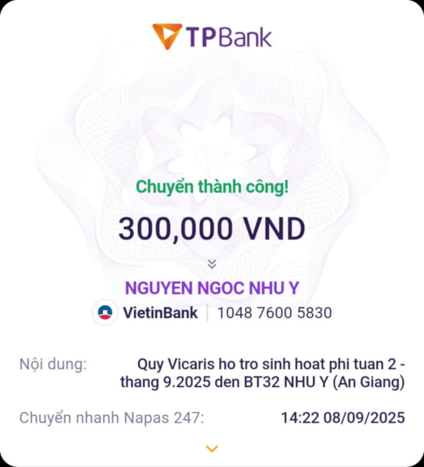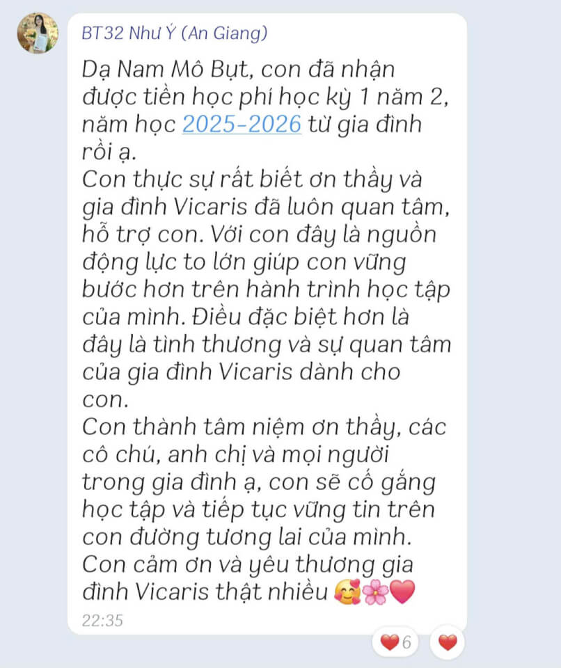 Trong tháng 9.2025, Quỹ Bảo trợ giáo dục Vicaris đã hỗ trợ 25 học sinh, sinh viên đang được tiếp nhận bảo trợ trong năm học 2025-2026, bao gồm học phí, sinh hoạt phí và các chi phí học tập khác. Trong đó có 4 em vừa được tiếp nhận bảo trợ là Ngọc Nhi – Ngọc Diệp (TP.HCM) và Hạnh Nguyên – Tuyết Ngân (Đồng Tháp) và 04 anh em Thị Hà (Quảng Trị) tiếp tục nhận tiền bảo trợ được gửi trực tiếp từ quý mạnh thường quân. nhận tiền bảo trợ được gửi trực tiếp từ quý mạnh thường quân.