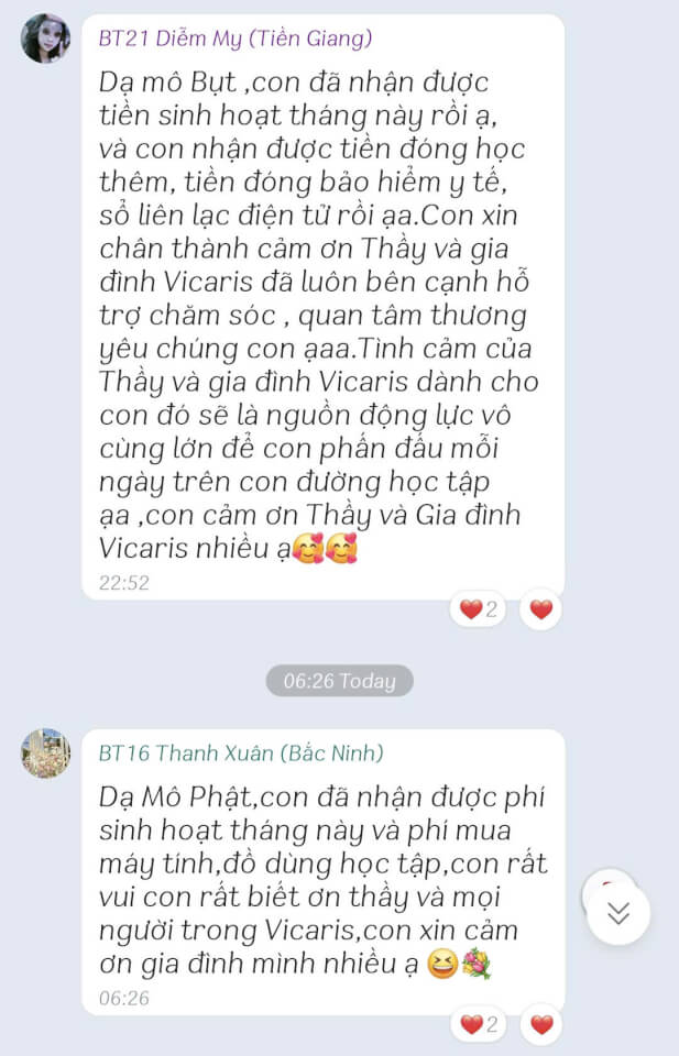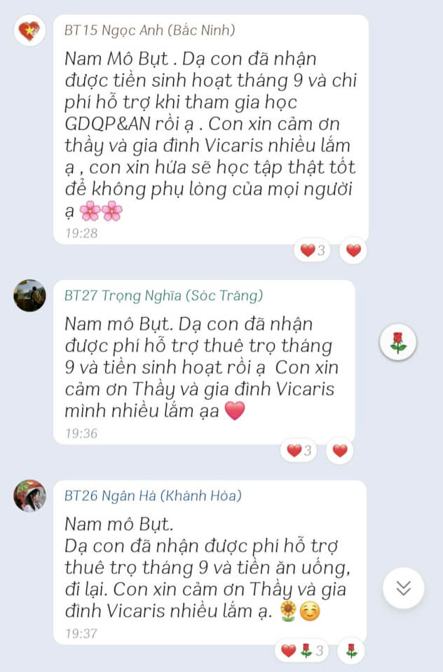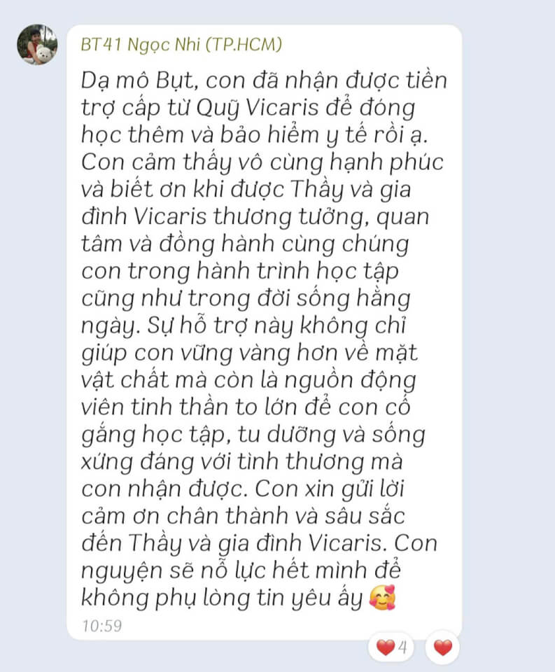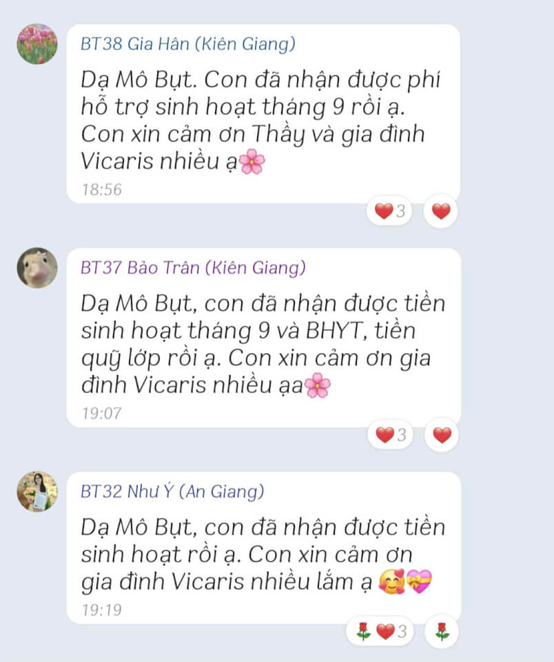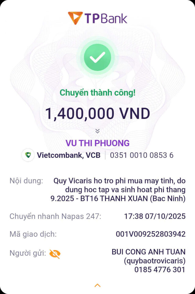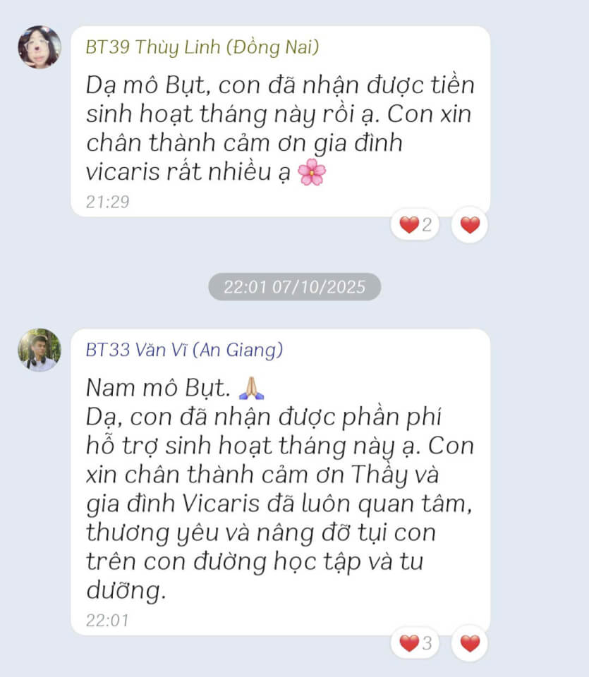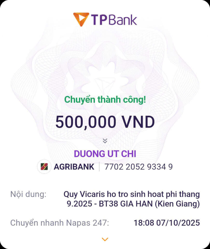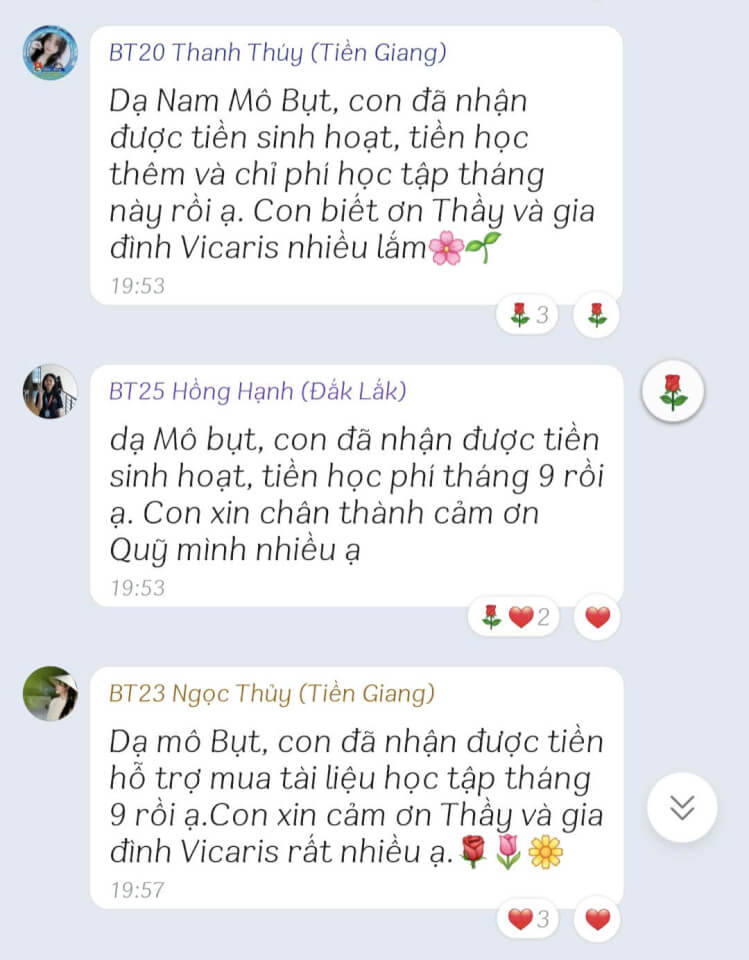 Trong tháng 9.2025, Quỹ Bảo trợ giáo dục Vicaris đã hỗ trợ 25 học sinh, sinh viên đang được tiếp nhận bảo trợ trong năm học 2025-2026, bao gồm học phí, sinh hoạt phí và các chi phí học tập khác. Trong đó có 4 em vừa được tiếp nhận bảo trợ là Ngọc Nhi – Ngọc Diệp (TP.HCM) và Hạnh Nguyên – Tuyết Ngân (Đồng Tháp) và 04 anh em Thị Hà (Quảng Trị) tiếp tục nhận tiền bảo trợ được gửi trực tiếp từ quý mạnh thường quân. nhận tiền bảo trợ được gửi trực tiếp từ quý mạnh thường quân.