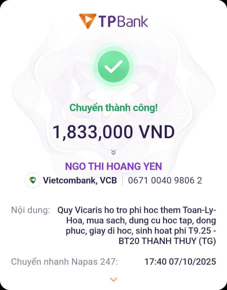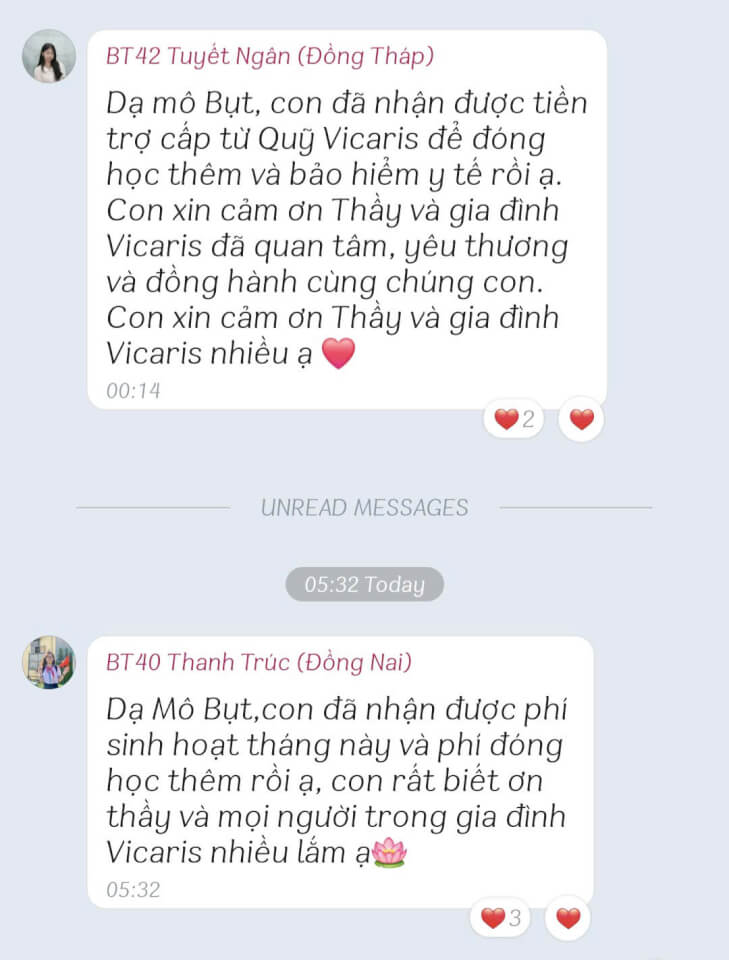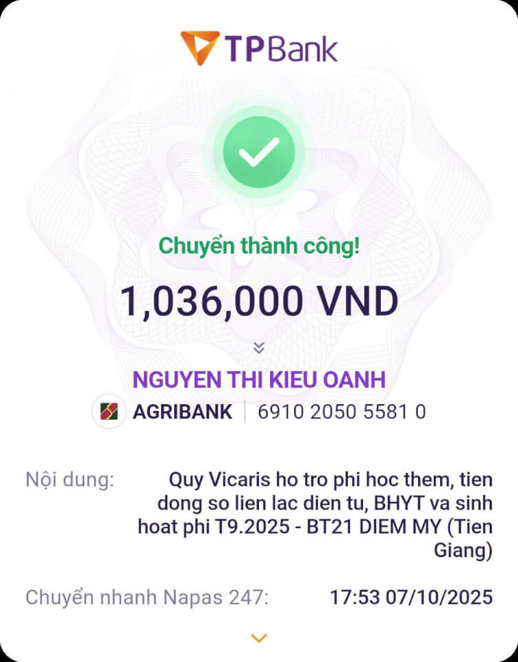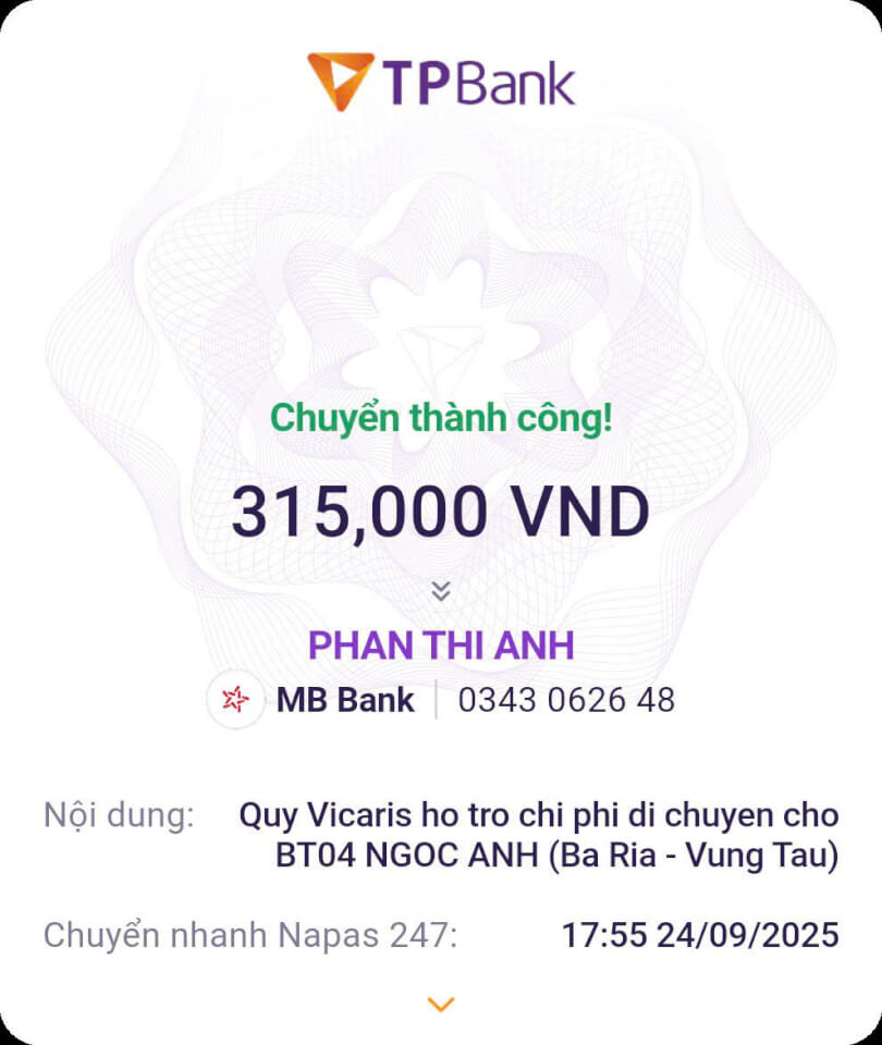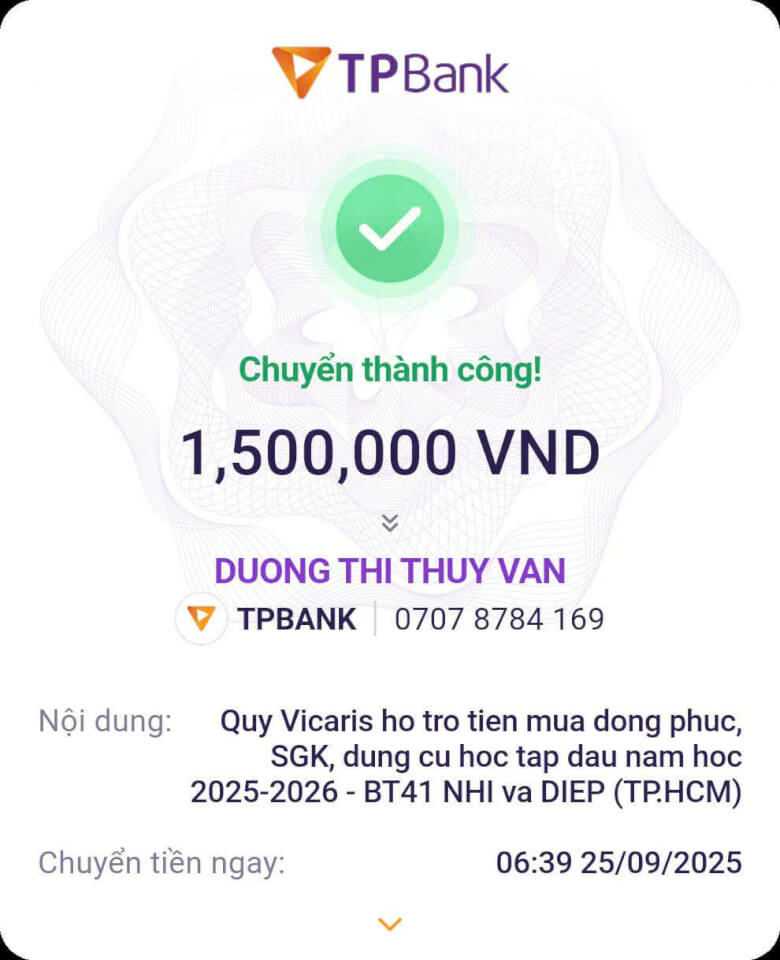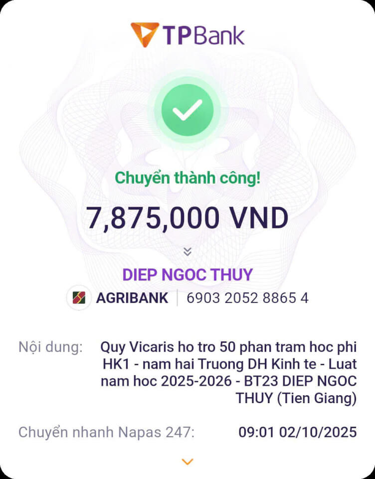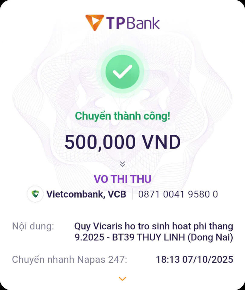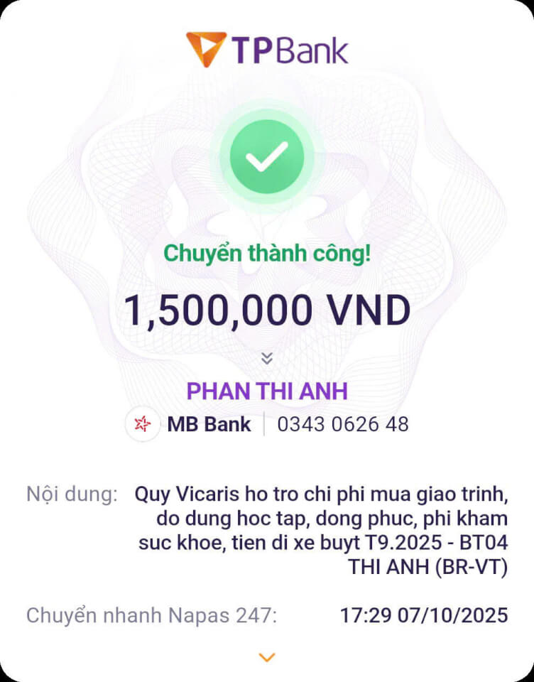 Trong tháng 9.2025, Quỹ Bảo trợ giáo dục Vicaris đã hỗ trợ 25 học sinh, sinh viên đang được tiếp nhận bảo trợ trong năm học 2025-2026, bao gồm học phí, sinh hoạt phí và các chi phí học tập khác. Trong đó có 4 em vừa được tiếp nhận bảo trợ là Ngọc Nhi – Ngọc Diệp (TP.HCM) và Hạnh Nguyên – Tuyết Ngân (Đồng Tháp) và 04 anh em Thị Hà (Quảng Trị) tiếp tục nhận tiền bảo trợ được gửi trực tiếp từ quý mạnh thường quân. nhận tiền bảo trợ được gửi trực tiếp từ quý mạnh thường quân.