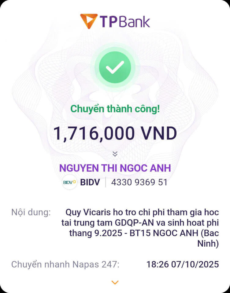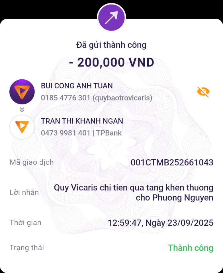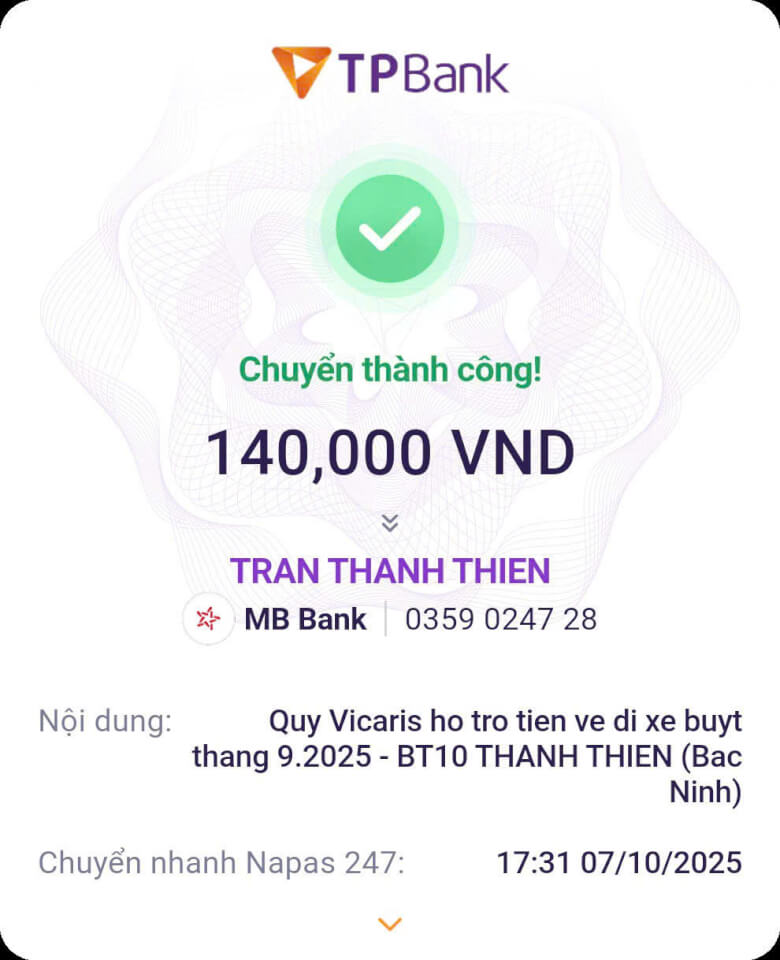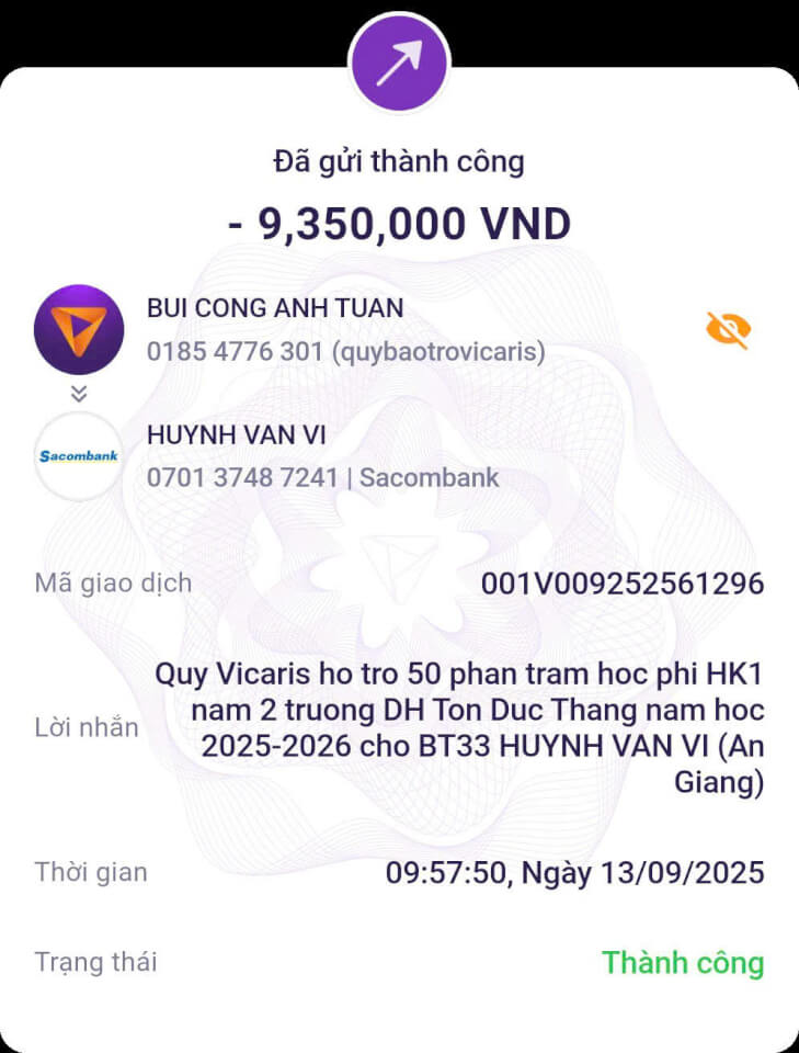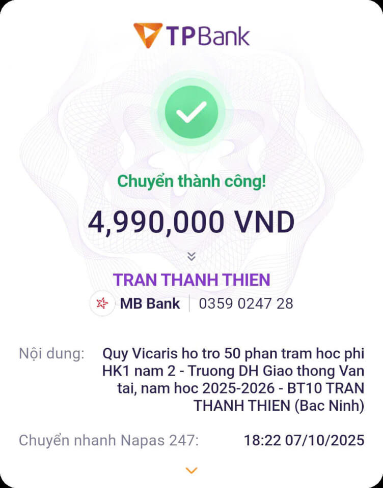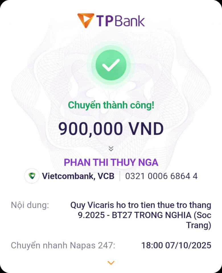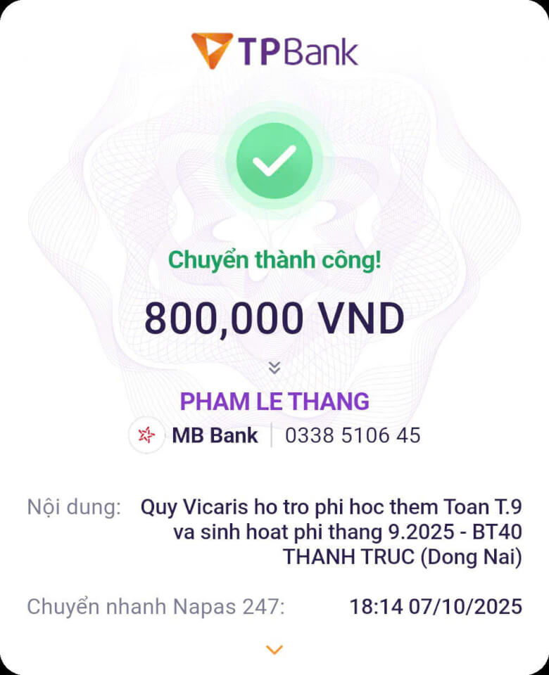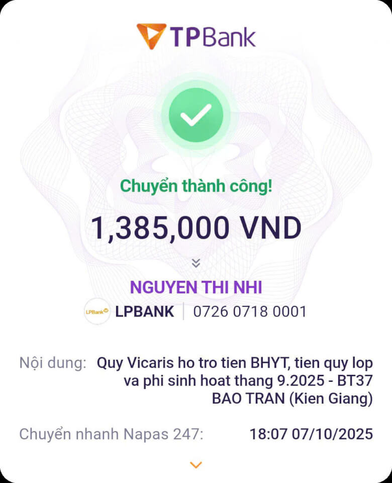Trong tháng 9.2025, Quỹ Bảo trợ giáo dục Vicaris đã hỗ trợ 25 học sinh, sinh viên đang được tiếp nhận bảo trợ trong năm học 2025-2026, bao gồm học phí, sinh hoạt phí và các chi phí học tập khác. Trong đó có 4 em vừa được tiếp nhận bảo trợ là Ngọc Nhi – Ngọc Diệp (TP.HCM) và Hạnh Nguyên – Tuyết Ngân (Đồng Tháp) và 04 anh em Thị Hà (Quảng Trị) tiếp tục nhận tiền bảo trợ được gửi trực tiếp từ quý mạnh thường quân. nhận tiền bảo trợ được gửi trực tiếp từ quý mạnh thường quân.