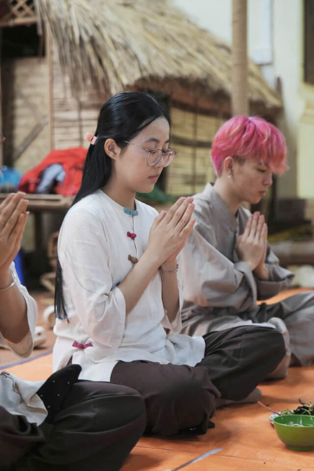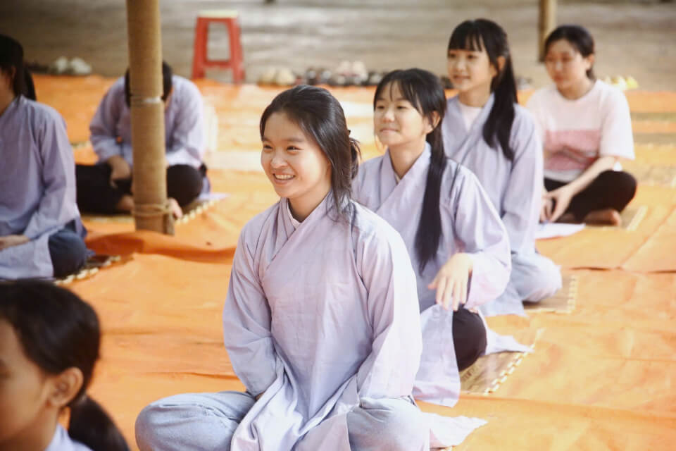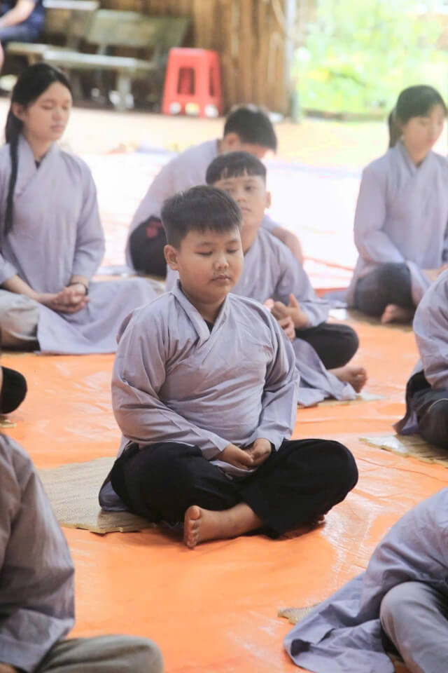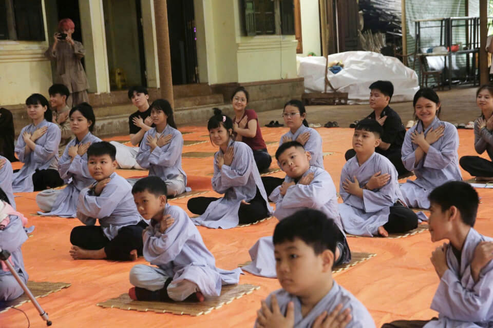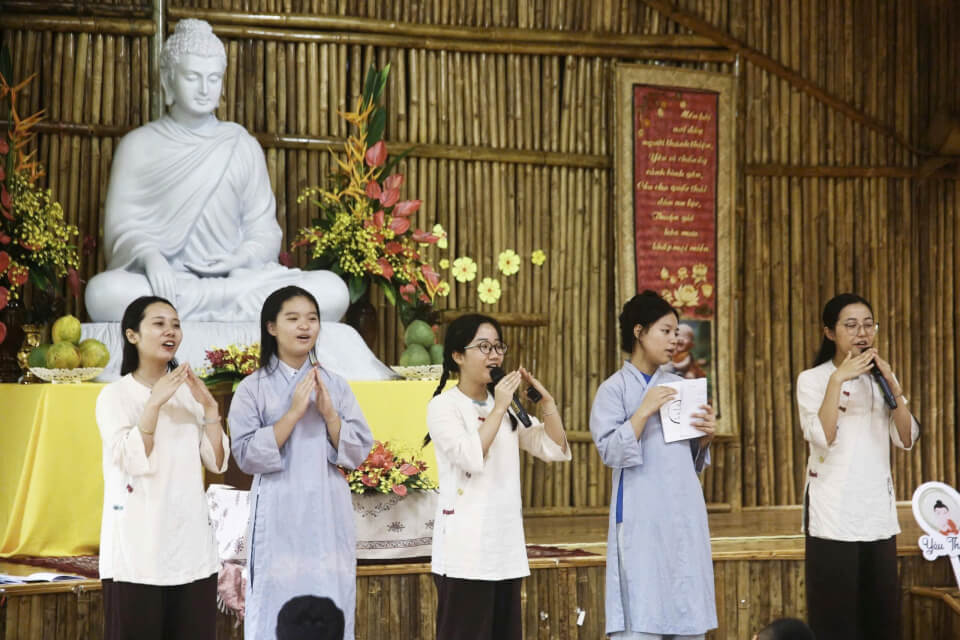 Trước khi được lắng nghe những chia sẻ từ Thầy, những bạn khoá sinh nhỏ đã được các chị thành viên Ban Chăm sóc Quỹ Vicaris hướng dẫn hát thiền ca. Thiền ca vốn là những bài hát nuôi dưỡng chánh niệm, cho người thực tập cảm giác nhẹ nhàng, an lành và giúp trở về tiếp xúc với sự sống nhiệm mầu trong từng khoảnh khắc.
